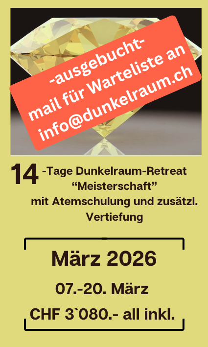 Die Erfahrung eines Dunkelraums macht meiner Meinung nach am meisten Sinn, wenn dies im Zusammenhang mit der Atemschule von Ananda und Claudia geschieht. Die Vermittlung dieser Methode ist einzigartig und mit der Erfahrung der Dunkelheit kann man tief in die Existenz und das Leben eintauchen. Ananda und Claudia vermitteln und begleiten das Retread liebevoll, professionell und mit voller Hingabe. Ich kann es nur empfehlen, eine meiner wichtigsten Erfahrungen.
